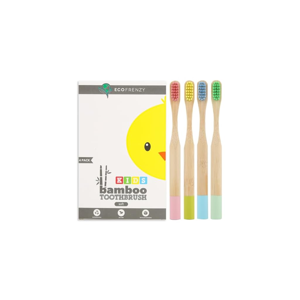 EcoFrenzy – Kids Bamboo Toothbrush – Child Size Soft BPA Free Color Safe Bristles (4 Pack)